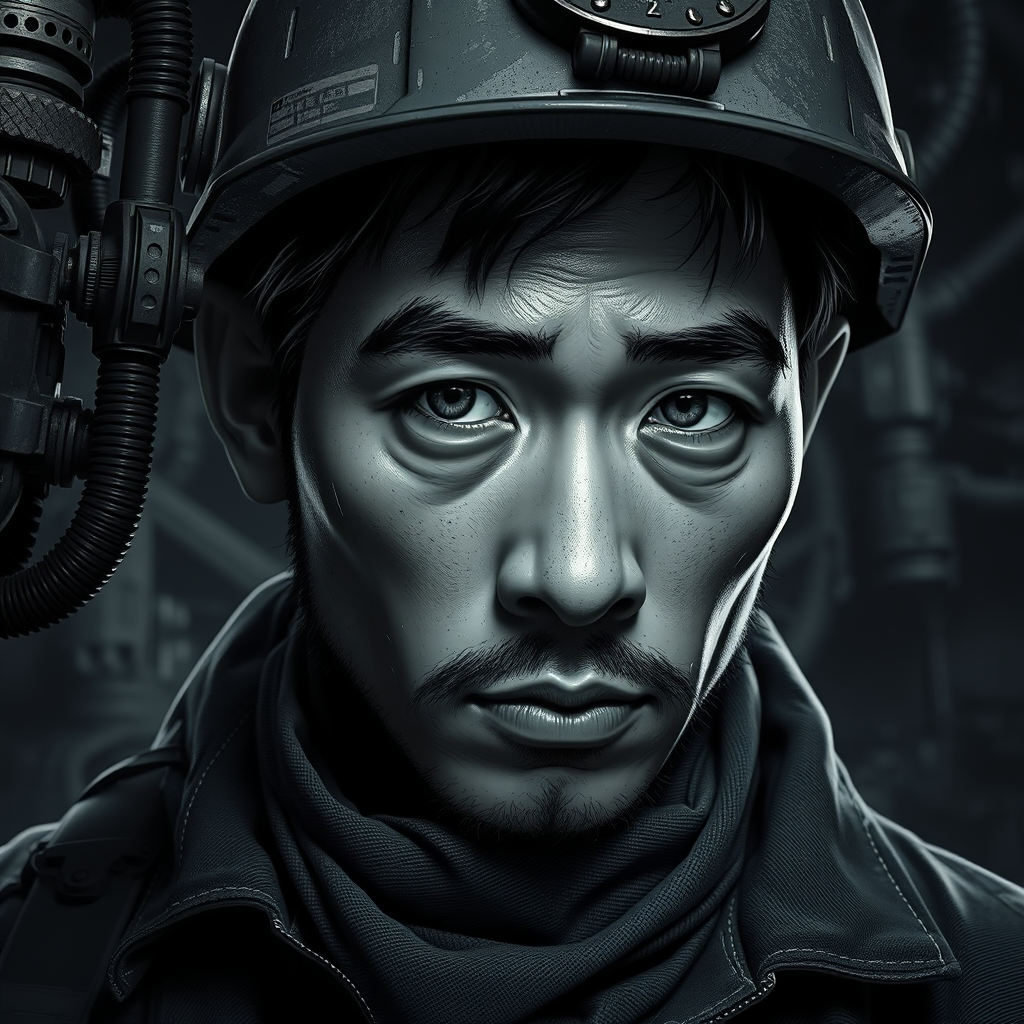 Photograph capturing the most exquisite artwork for a man featuring intricate industrial mechanics set in a fantastical location; a working environment showcasing a rugged worker in a harsh situation, full body, 8k unity render. It’s an action shot highlighting skin pores and detailed iris work, enveloped in very dark lighting with heavy shadows. The focus is on a detailed face, digital painting in octane render, reminiscent of art seen on ArtStation, smooth yet with sharp focus, a blend of illustration styles akin to Artgerm, WLOP, and Ilya Kuvshinov. The subject is Asian, depicted in a striking black and white close-up, with 3D elements and a hint of denim. The art avoids blurriness, eschews the lackluster, is free from signatures, letters, watermarks, and maintains high-quality resolution with no horrific mutations or poor quality artifacts; it’s meticulously uncropped and unflaggingly remains a digital masterpiece.