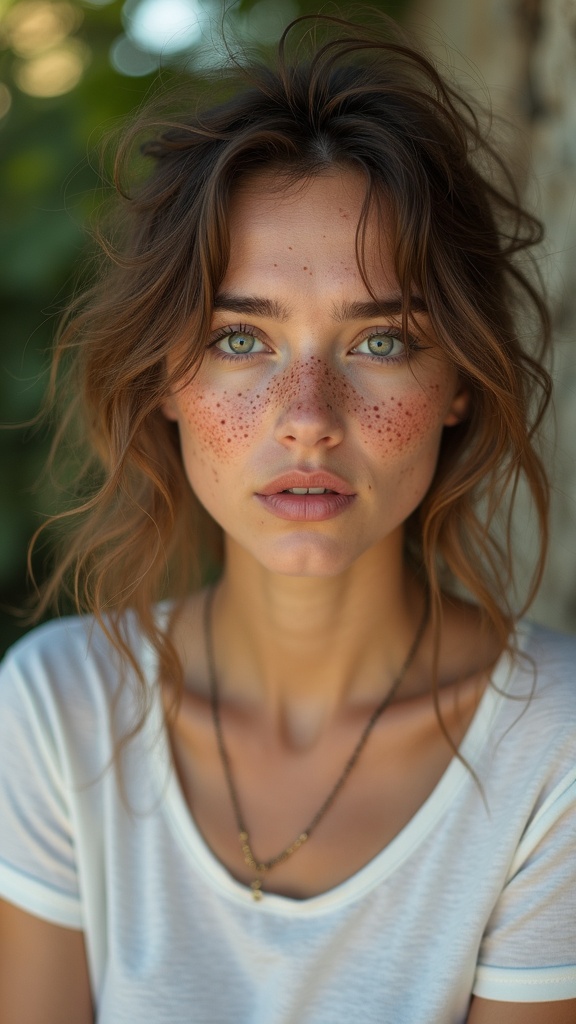 A captivating and lifelike photograph of a woman with an abundance of freckles, expressive round eyes, and tousled hair. She is outdoors, dressed in a casual white t-shirt. Her skin showcases a natural texture with chapped lips, bathed in soft and warm natural lighting. This portrait is shot with an 85mm lens, rendering a magical and dramatic quality. The imagery is photo-realistic and exceptionally detailed, capturing the essence of Cinestill 800T film with an easygoing, relaxed style. The scene exudes an enchanting ambiance, reminiscent of a serene and introspective moment.