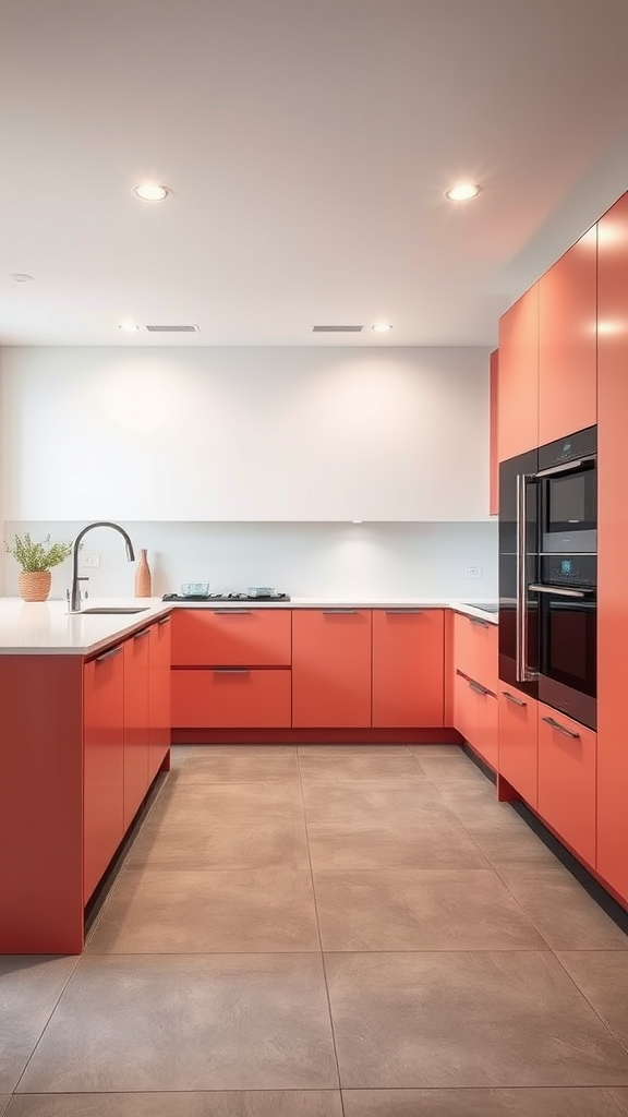 Photograph features a minimalist kitchen with a sleek matte coral finish. The modern silver faucet stands out against high-end integrated appliances that maintain a streamlined appearance. The flooring consists of matte warm grey tiles, introducing a subtle texture and a cool tone to the space. Recessed lighting in the ceiling offers an even distribution of soft light, enhancing the clean lines and smooth surfaces within the kitchen. Simple ceiling design complements the overall aesthetic. UHD aspect ratio of 9:16.