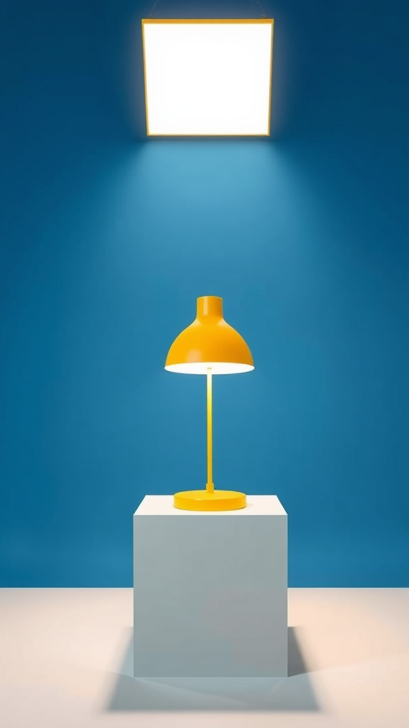 Photograph featuring a front view of a Louis Poulsen Panthella 250 table lamp in vivid yellow, positioned prominently on a 45-degree white square pedestal within a professional photo studio environment. Captured using a Nikon D850 camera equipped with a Nikon AF-S Micro-Nikkor 60mm f/2.8G ED lens, the settings include an aperture of f/8 and an ISO of 100. The background is a deep blue solid color that contrasts with the vibrant lamp. Studio lighting, paired with a square softbox, provides realistic and natural sunlight-like illumination, enhancing the lamp's sleek and reflective surface. The scene is meticulously photorealistic and highly detailed, presented in 8K UHD resolution without the presence of strange shapes, text, or unnecessary elements.