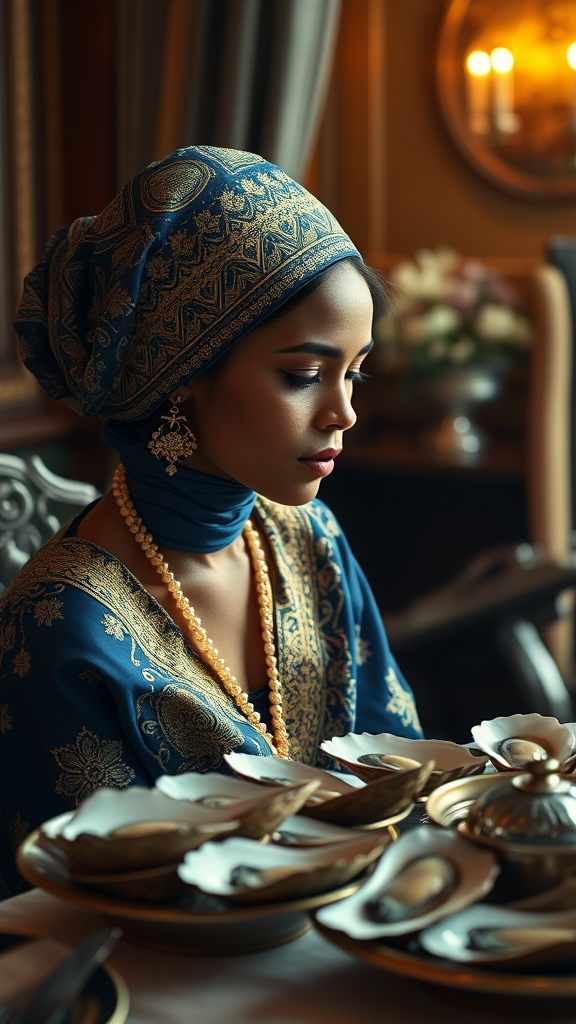 Photograph featuring a sei-gwpe seated at a finely set table adorned with a platter of oysters; the image captures a hyper-realistic scene with cinematic lighting. The subject dons an intricately detailed blue and gold headscarf, complemented by an elegant pearl earring, all shot with the clarity and depth of a 50mm lens. In the background, soft ambient light imbues the setting with warmth, enhancing the luxurious and inviting atmosphere.