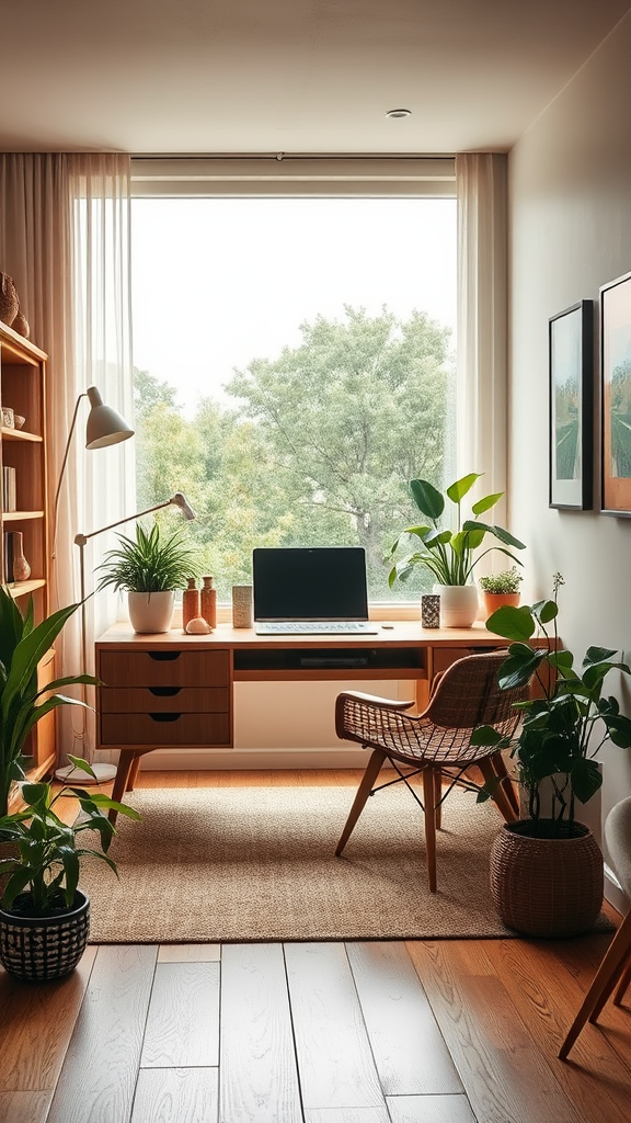 Photograph of a cozy mid-century modern home office on a cloudy day, the warm white light creates an inviting ambiance with discreetly placed objets d'art enhancing the space's charm, featuring natural wood textures and hints of vintage decor amidst lush green houseplants.