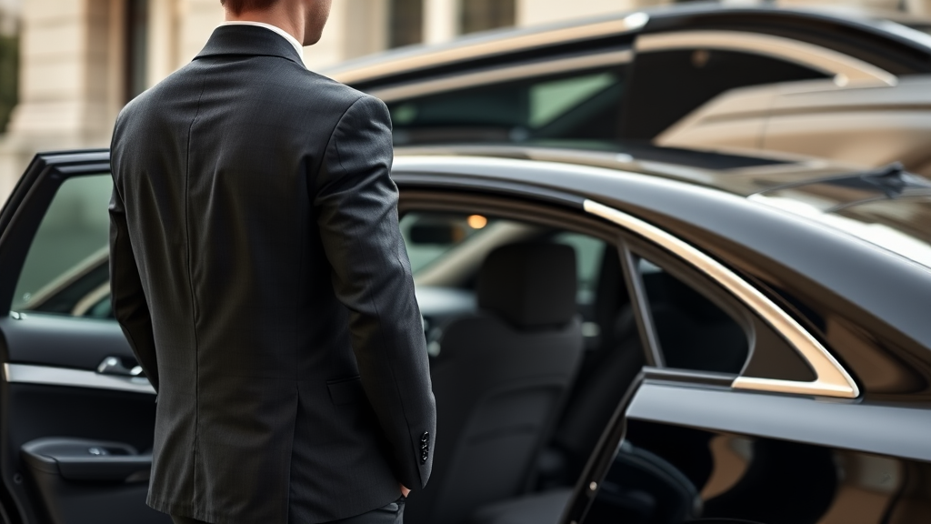 Photograph of a distinguished car service, a professional chauffeur in a tailored black suit standing by a sleek black luxury vehicle, focus on the elegance of the open back door, captured with a Leica 50mm lens at f1.4, exuding an aura of refinement and exclusivity.