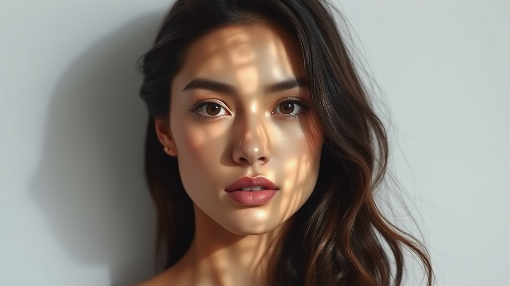 Photograph of a female model standing against a plain white background, her features softly illuminated by a gentle flare casting intricate light patterns across her face, giving a sense of ethereal invisibility, maintaining a natural and unfiltered style.