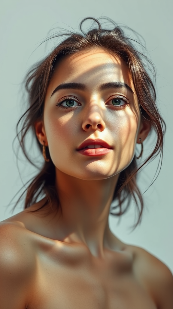 Photograph of a female model with a neutral expression, set against a plain white backdrop, soft light playfully scattering across her features, giving a dreamy and slightly ethereal effect, her presence subtly blending into the background, high contrast with a natural and unfiltered style.