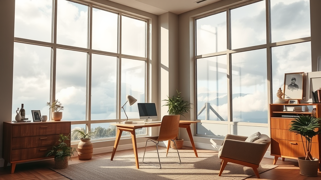 Photograph of a home office set in a mid-century style, with large windows revealing a cloudy sky, casting a soft neutral light throughout. The space exudes warmth and invitation, with subtly placed items that add charm and personality, creating a cozy yet professional environment.
