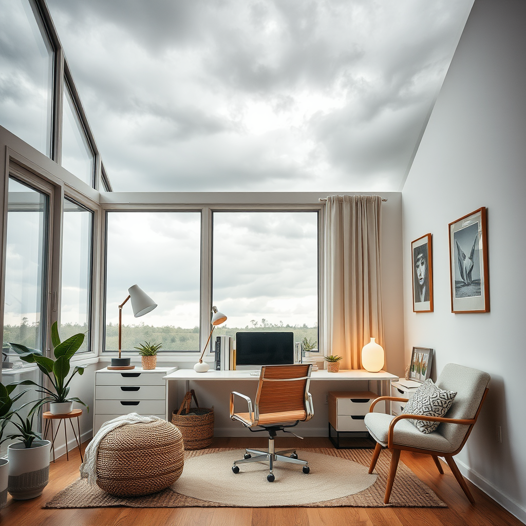 Photograph of a home office showcasing mid-century design elements under a cloudy sky, creating a cozy and inviting atmosphere with warm white tones and carefully placed decorative objects, captured in a raw style with an artistic flair.