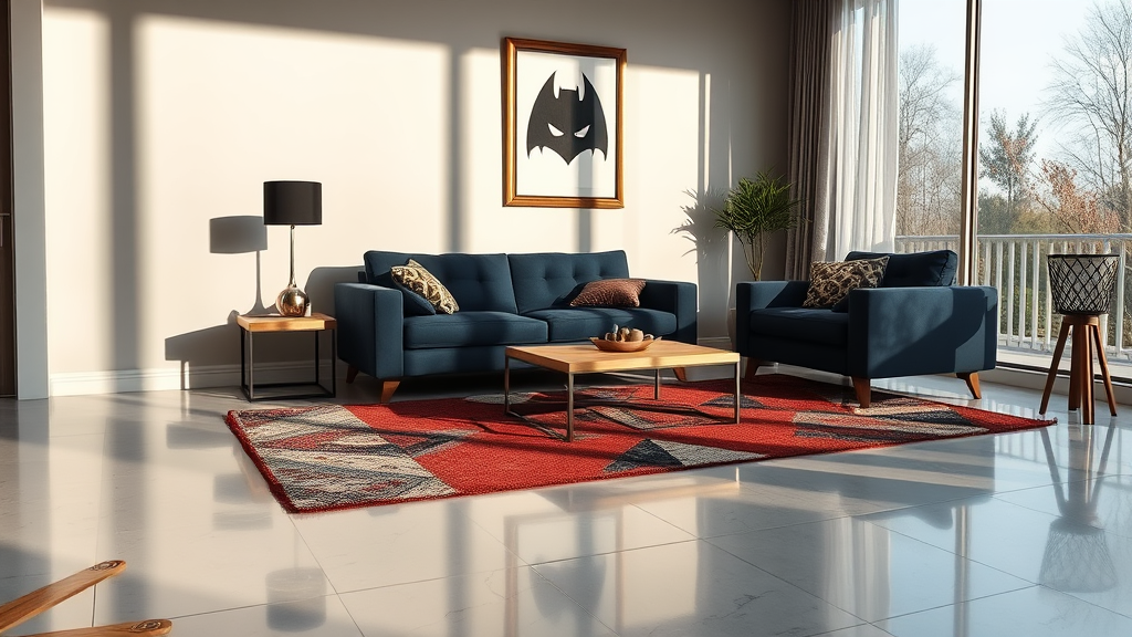 Photograph of a modern lounge in the morning featuring a sleek polished tile floor, with unique rug elements. A Batman art frame adds character to the space. A dark blue sofa set complements a wooden side table, while ample natural light streams in, casting gentle shadows. The scene is captured in ultra-high definition in a slightly chaotic and raw style, embodying its contemporary atmosphere.