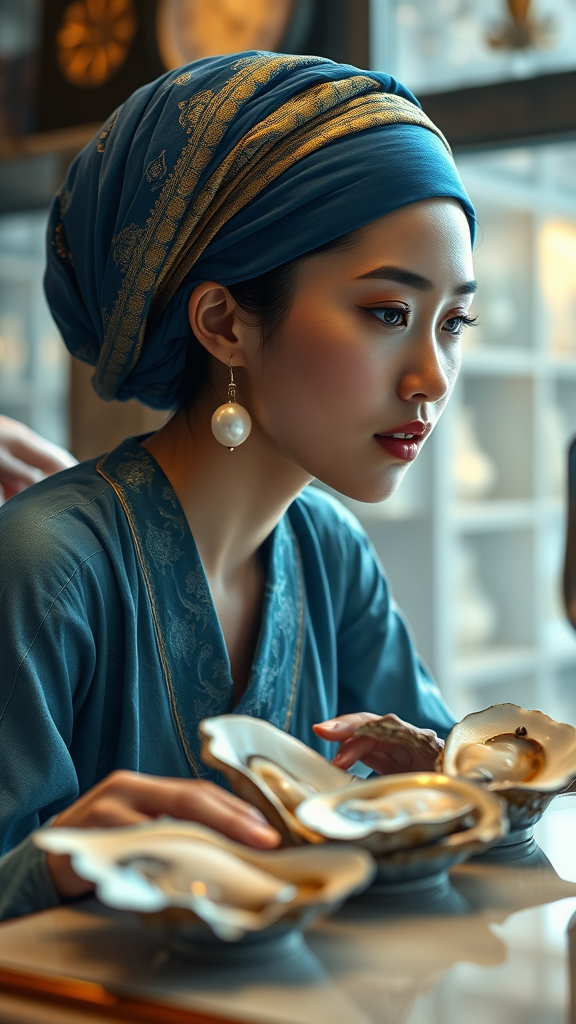 Photograph of a sei-gwpe seated at a table with oysters, captured in stunning 4k quality with cinematic lighting, showcasing a hyper-realistic detail through a 50mm lens. The character wears a lustrous pearl earring, complemented by an elegant blue and gold headscarf, adding an air of sophistication. Subtle reflections dance across the polished table surface, enhancing the scene's opulent ambiance.