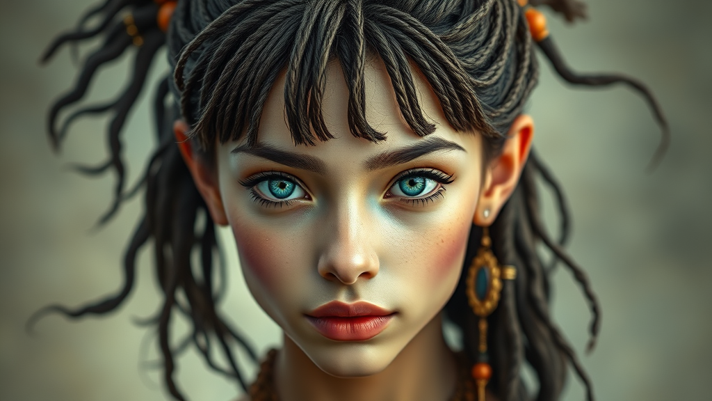 Photograph of an androgynous figure with delicate, captivating features, a strikingly beautiful face, and an oval jawline. The hair is styled in intricate dreadlocks with long bangs and a flowing ponytail. The eyes are a mesmerizing bright blue-green. Elements of Hindu art infuse the image, enhancing its ethereal and timeless quality.