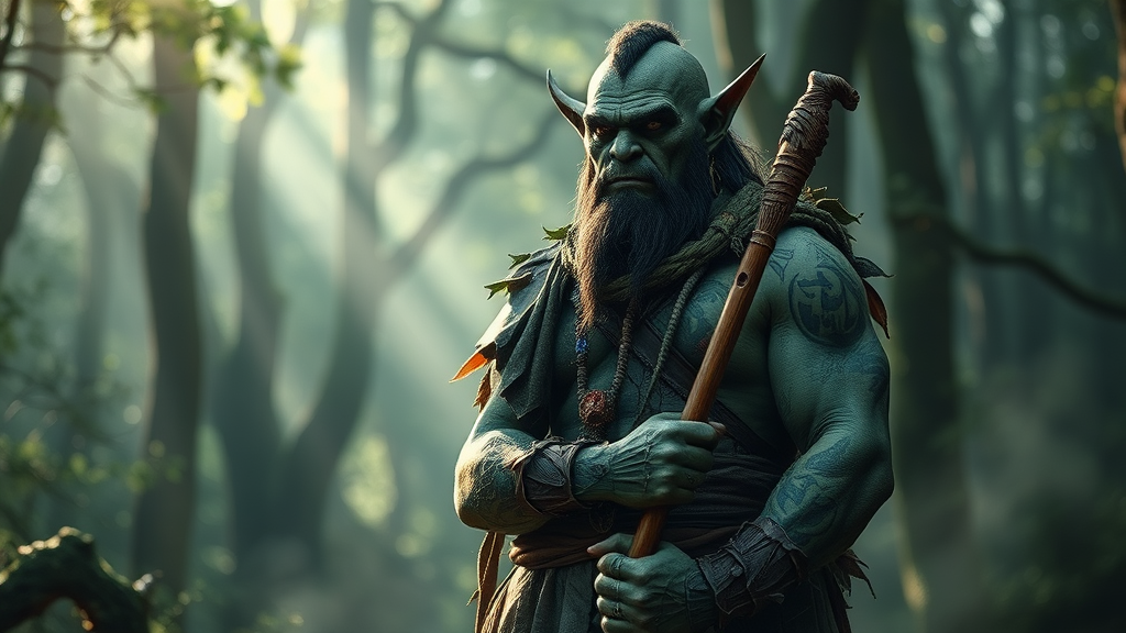 Photograph of an ultra-realistic male orc druid standing in a mystical forest, enveloped in a soft, ethereal glow with light fog swirling around his feet; his rugged, green skin is intricately detailed, revealing ancient tribal tattoos under the dappled sunlight filtering through the canopy; wearing a robe crafted from leaves and vines, the orc holds a wooden staff adorned with crystals and feathers; his fierce eyes gleam with wisdom and power, casting intense shadows across his chiseled features; rendered in stunning hyper-realism, reminiscent of John William Turner's evocative landscapes, capturing the surreal beauty and majesty of this otherworldly creature.