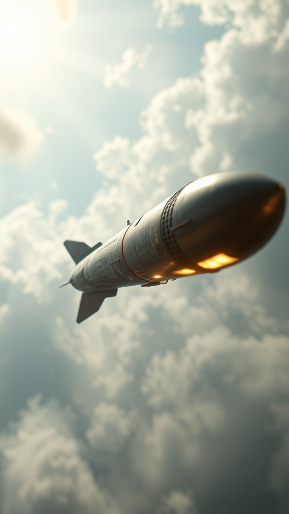 Photograph of an ultra realistic missile in motion, radiant illumination, cinematic lighting, weathered texture, low angle perspective, popular on artstation, 8k ultra HD quality, hyper realistic detail, sharp focus, extreme intricacies, powered by unreal engine 5, dramatic composition, masterful work reminiscent of Studio Ghibli, detailed artistry influenced by J.M.W. Turner, unique artistic elements enhancing the core concept.