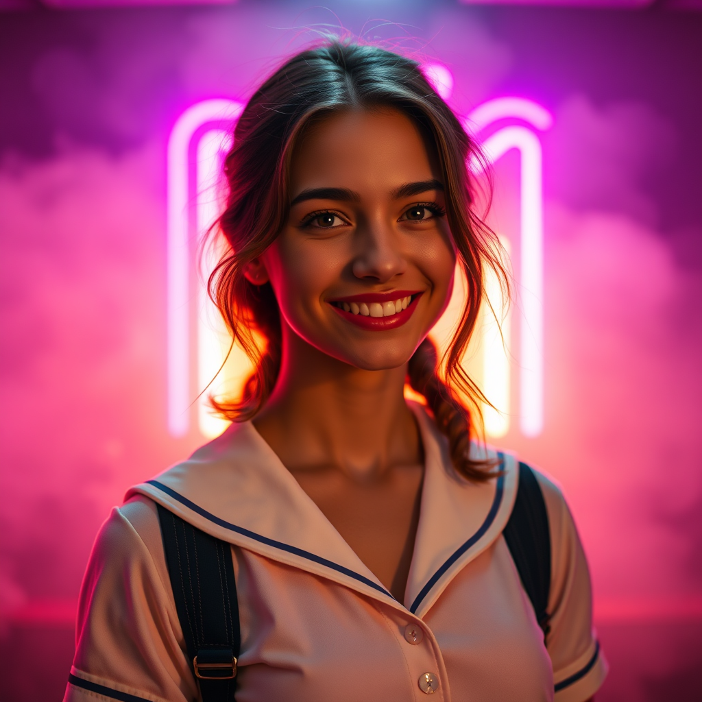 Photograph of Anya Taylor-Joy wearing a classic preppy schoolgirl uniform, her radiant smile highlighting her flawless features and glowing olive skin, set against a vibrant neon light background infused with swirling smoke. The atmospheric scene is enriched with volumetric fog, capturing the essence of hyperrealism with intricate detail. The indirect lighting adds depth and dimension, producing a mesmerizing and breathtaking image in 8k UHD quality.