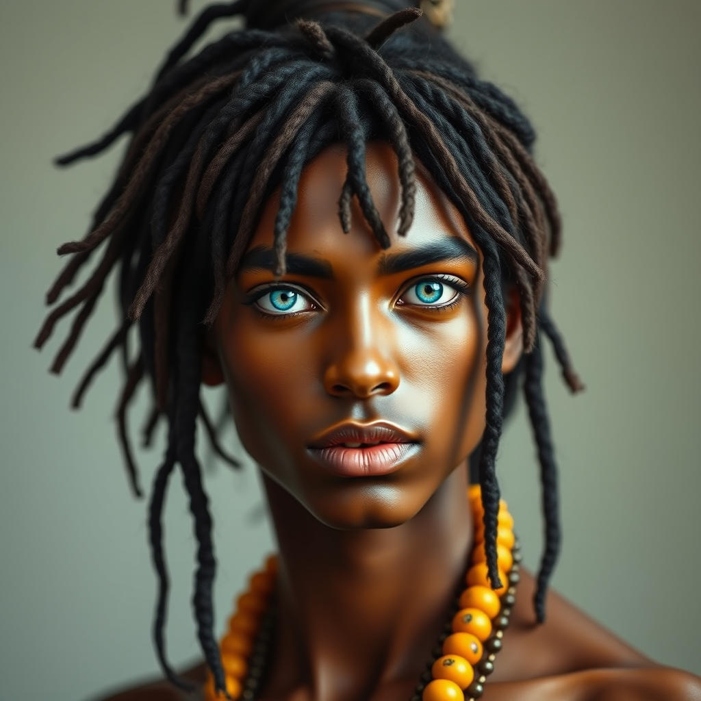 Photograph portrait, androgynous hanuman-inspired figure, defined oval jaw, delicate facial features, striking beauty, dreadlocked hair with long flowing bangs and ponytail, captivating bright turquoise eyes, infused with elements of Hindu art.