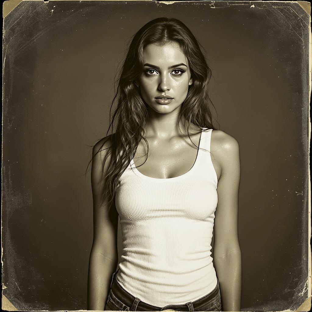 View this AI-generated image featuring a sepia toned photograph of a ukrainian woman in a tank top inspired by alasdair mclellan s style showcasing her youthful and slender form hinting at a tomboy charm she has long flowing hair reminiscent of julia garner with a sheen of sweat highlighting her str