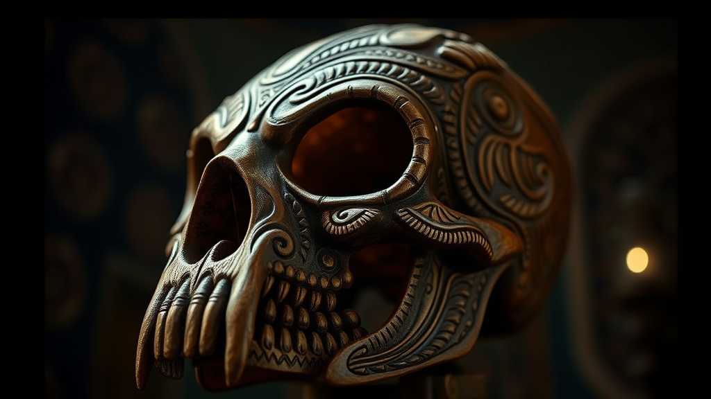 Photographic cinematic depiction of intricately carved Maori skull, showcasing detailed patterns and cultural artistry, with atmospheric lighting enhancing its depth and mystery.