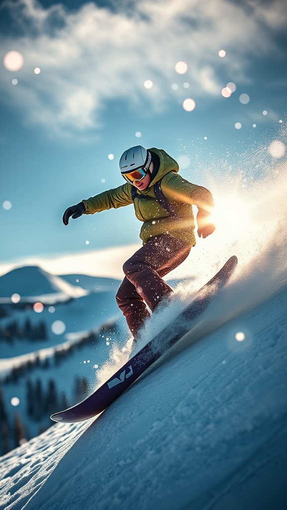 Photographing a professional snowboarder in action at the snowboard park, capturing the thrill and energy of the moment. Shot with a Canon EOS-1D X Mark III and Canon EF 70-200mm f/2.8L IS III USM lens, achieving excellent dynamic range and depth of field. The image showcases a clear, realistic depiction of sunlight filtering through fluttering snowflakes against a dramatic landscape, with rich, intricate details and a focus on raw, authentic imagery. Emphasizing a personalized touch with a unique code, the aspect ratio stands at 9:16, enhancing the immersive experience with a stylized, vibrant feel reflecting the essence of action sports.