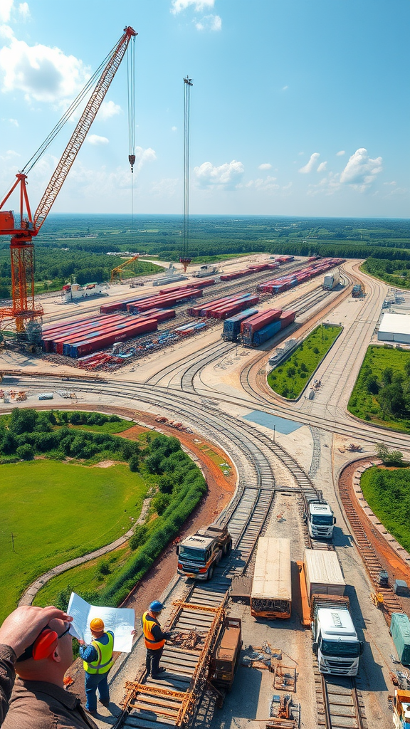 Photographs capturing the ongoing construction of the dry port in Drogobich, showcasing cranes lifting shipping containers, workers in safety gear installing rail tracks, engineers reviewing blueprints, trucks transporting building materials, and aerial views of the evolving infrastructure surrounded by lush green landscapes and clear skies.