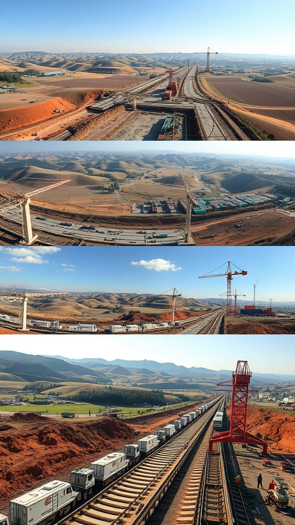 Photographs showcasing the development of the dry port in Drogobich, capturing key construction phases such as land preparation, foundational groundwork, installation of infrastructure components like cranes and rail lines, and workers engaging in collaborative tasks, the backdrop of rolling hills subtly enhanced to emphasize the integration of modern logistics with the surrounding environment.