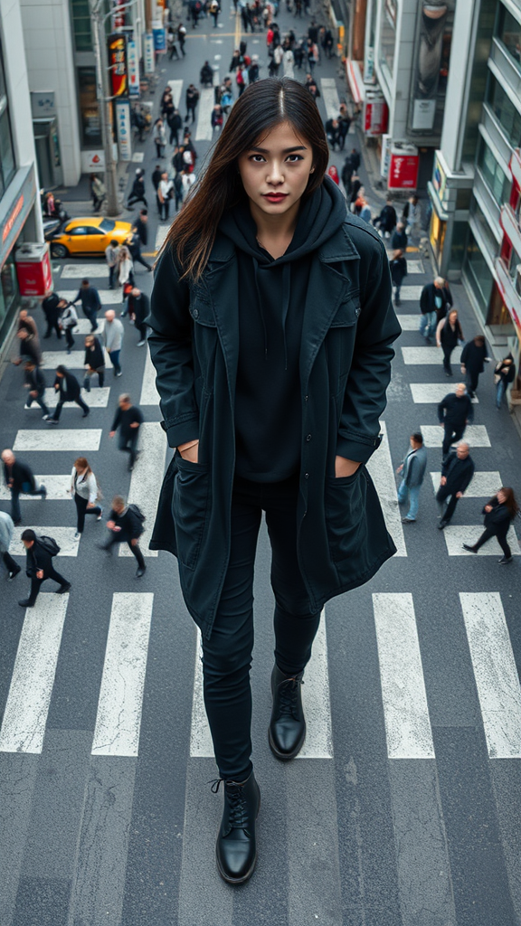 Photography aerial perspective capturing a professional model confidently standing at the heart of a labyrinthine crosswalk reminiscent of Shibuya's bustling scramble, eyes locked onto the camera. She wears a sleek black safari long jacket layered over a black hoodie, paired with stylish black cargo pants and dark charcoal boots. The image exudes realism, focusing on authentic expressions and intricate details, free from any incomplete forms or unusual markings, shot in an aspect ratio of 9:16, embracing a raw style with a touch of creative flair.