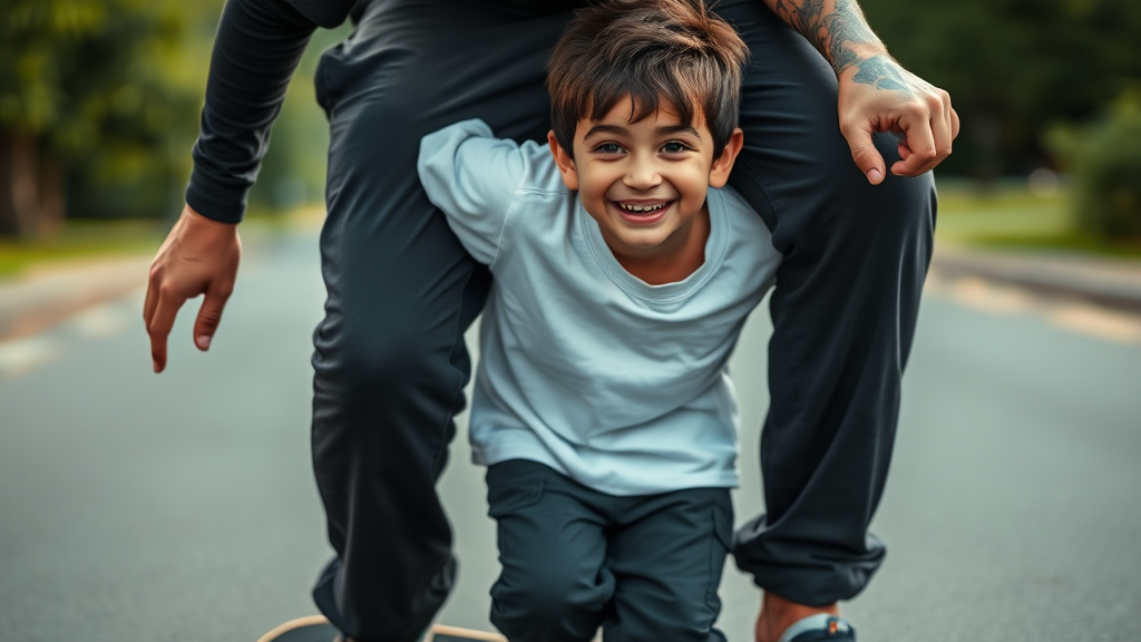 Photography, candid shot capturing a joyful moment, a boy and his dad, both beaming with wide grins, riding a skateboard together. The boy sports a loose-fit white T-shirt radiating a playful yet cool vibe, paired with dark grey cargo joggers. He holds onto the sturdy hands of his dad, visible from the waist down, dressed in black loose-fit long sleeves with intricately tattooed hands. Both wear Nike SB skateboard shoes, highlighting a contrast between fresh and well-worn comfort. The image captures a perfect balance and face-to-body ratio, embodying the shared joy of different generations. Bathed in the soft, natural light of a peaceful setting, the photograph is taken with a Sony α9 II and a Sony FE 100-400mm f/4.5-5.6 GM OSS lens, achieving a high-contrast effect, UHD.