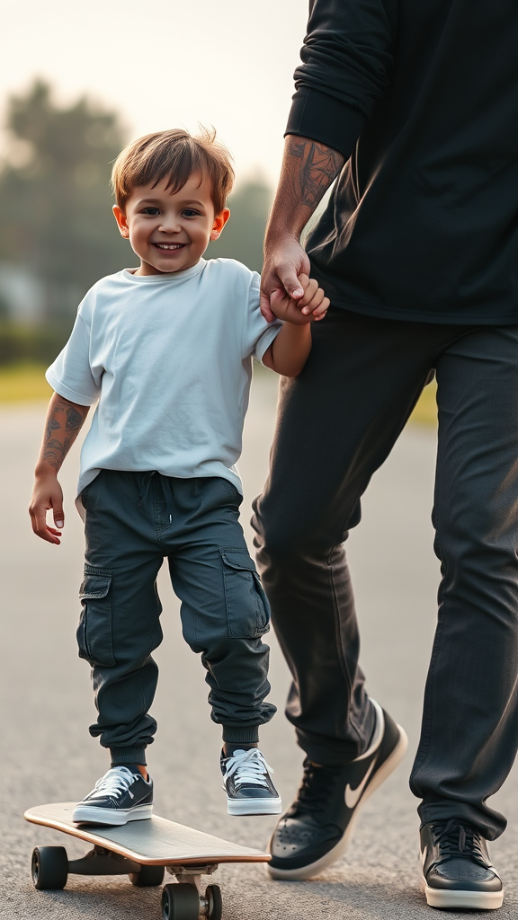 Photography candid shot of a boy and dad, both beaming with wide grins, the boy stands confidently on a skateboard wearing a white loose-fit T-shirt that has a playful yet cool vibe, paired with dark grey cargo joggers. They're holding onto the strong hands of an adult, whose lower half is visible, dressed in black loose-fit long sleeves and showcasing detailed tattoos on the hands. Both wear Nike SB skateboard shoes, highlighting a contrast between new and comfortably worn. The scene captures a perfect balance and face-to-body ratio, radiating shared joy between generations. It's bathed in soft, natural light within a serene setting, captured using a Sony α9 II with a Sony FE 100-400mm f/4.5-5.6 GM OSS lens, achieving a high-contrast effect. The image is in UHD with raw style and a stylize factor of 600, maintaining the essence of harmony and connection.
