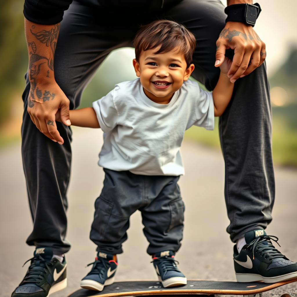 Photography captures a candid shot of a boy and his dad, both beaming with wide grins as they stand on a skateboard. The boy, exuding a playful yet cool vibe, wears a white, loose-fit T-shirt paired with dark grey cargo joggers. He confidently grips the strong hands of an adult, whose visible lower half shows black loose-fit long sleeves and intricately tattooed hands. Both are wearing Nike SB skateboard shoes, contrasting between new and comfortably worn styles. The scene depicts perfect balance, a harmonious face-to-body ratio, and the shared joy between generations. This moment is beautifully set in the soft, natural light of a serene environment, captured using a Sony α9 II camera with a Sony FE 100-400mm f/4.5-5.6 GM OSS lens, with a high-contrast effect accentuating every detail, in UHD resolution with a vertical orientation.