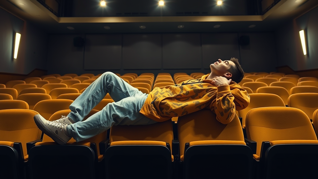 Photography captures a long shot with a professional male model lounging across the seats in a lightly lit movie theater, capturing a moment of carefree relaxation. He's clad in an oversized yellow camouflage hoodie and faded light-washed jeans. The scene showcases the theater's full architectural view, with a soft, ambient glow from the ceiling lights enhancing the serene atmosphere. The photorealistic style is highlighted by high contrast and bright highlights, creating a vivid and immersive experience, UHD quality, with an aspect ratio of 9:16.