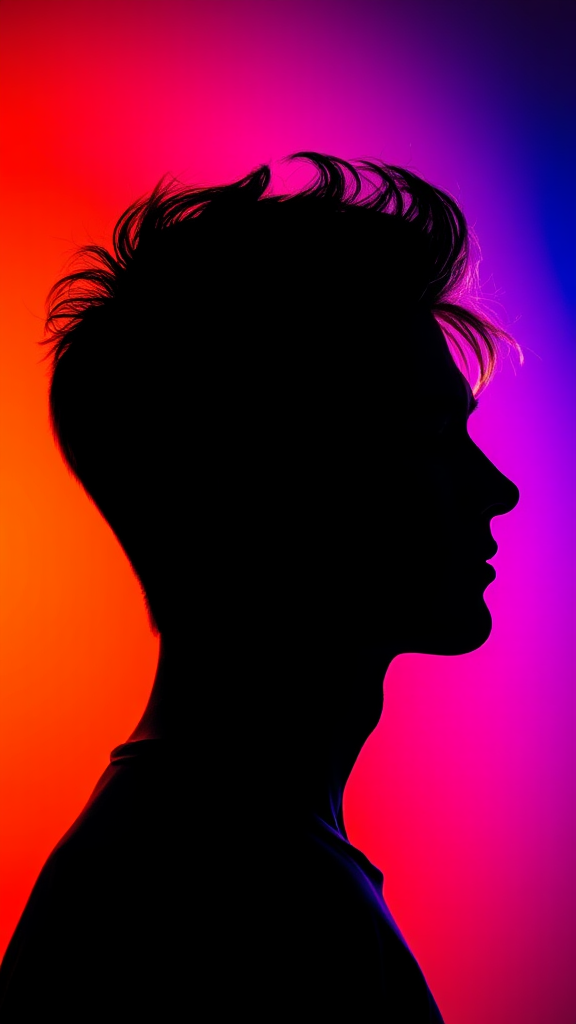 Photography captures a striking portrait of a male model's silhouette against a vividly colorful background. The powerful contrast highlights the contours of his face and hair, creating a mesmerizing dance of light and shadow. Randomly chosen colors sharply stand out, achieved through a camera setup that emulates a large aperture of f/1.4 for a shallow depth of field. Focus is maintained solely on the silhouette's edge, rendering it in ultra-high definition, with an aspect ratio of 9:16, portrayed in a raw yet captivating style.