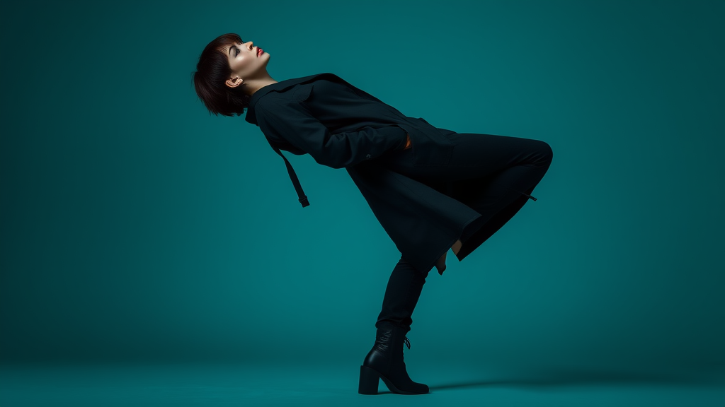 Photography capturing a female model in a striking side pose, upper body leaning backwards at a 15-degree angle with her head slightly tilted down. She exudes a provocative expression complemented by a chic, avant-garde hairstyle. Dressed in a minimalist, full-length black coat paired with stylish black cargo jeans, her look is completed with untied shoelaces on matte black combat boots, encapsulating minimalist fashion. Her silhouette is dramatically highlighted against a cool, deep teal gradient background, rich in intricate detail, drawing emphasis to her enigmatic presence.