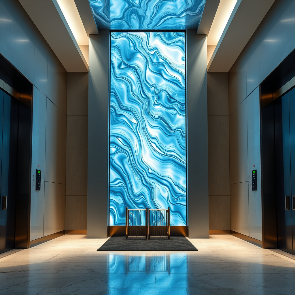 Photography capturing a sleek and minimalist elevator lobby in a corporate building, front view at eye level, taken with a Canon EOS 5D Mark IV and EF 24mm f/1.4L II USM lens set at f/2.8. The lobby features a vertical media art installation as its centerpiece, showcasing a fluid, metallic sheen with shades of blue that ripple across its surface, offering a vibrant contrast to the understated elegance of the surroundings. The space is defined by clean lines and a modern control gate system for secure access. Premium materials are carefully chosen for their texture and reflective qualities, enhancing the luxurious ambiance. The photograph showcases the height and grandeur of the lobby, focusing on the harmony between technology and art, with ultra-resolution detail emphasizing the material finishes and ambient lighting, capturing the realism and style in a raw aesthetic with a touch of creativity in a 9:16 aspect ratio.