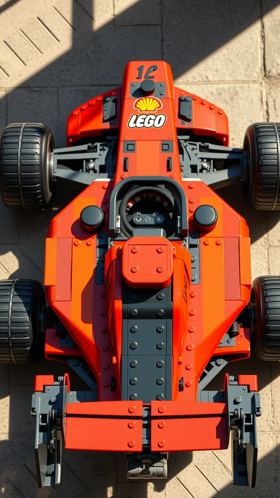 Photography capturing a top view of a real-scale LEGO F1 car creation, highlighting intricate brick details and craftsmanship, perfectly composed. The scene is bathed in natural lighting, casting soft shadows to enhance its photorealism and rich detailing. Incorporate subtle creative elements to add uniqueness while preserving the essence of LEGO artistry and precision.