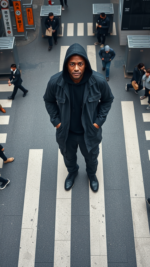 Photography capturing an aerial view of a professional model standing confidently at the center of an intricate crosswalk inspired by the bustling Shibuya scramble. The model gazes directly into the camera, exuding charisma. Dressed in a sleek, black safari-style long jacket over a black hoodie, paired with dark cargo pants and charcoal grey boots, the scene is set for a striking, realistic photograph. The composition maintains a unique raw style, emphasizing bold visual elements and authenticity while avoiding any incomplete expressions or unnecessary symbols, ensuring a polished and captivating image.