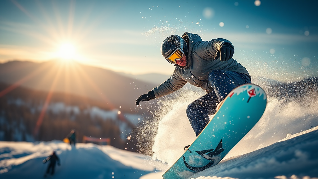 Photography capturing the thrilling essence of action sports, focusing on a professional snowboarder performing daring maneuvers in the snowboard park. The image is shot using a Canon EOS-1D X Mark III with a Canon EF 70-200mm f/2.8L IS III USM lens, highlighting a stunning depth of field and crystal-clear detail. The scene is bathed in realistic sunlight, with snowflakes fluttering in the air against a dramatic and rich landscape backdrop. The composition exudes a raw, vibrant style, with a personalized flair, offering a portrait that celebrates the energy and skill of the snowboarder, captured in an awe-inspiring 9:16 aspect ratio.