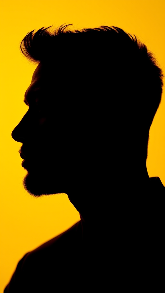 Photography, dramatic portrait of contrast, profile silhouette of a man with defined features, vivid yellow background, captured with a camera setup that uses a wide aperture to emphasize the sharpness of the silhouette's edge, utilizing a low ISO to ensure deep, rich colors with no noise, photorealistic and ultra-high definition, aspect ratio 9:16, refined raw style with subtle creativity in light play and shadow depth.