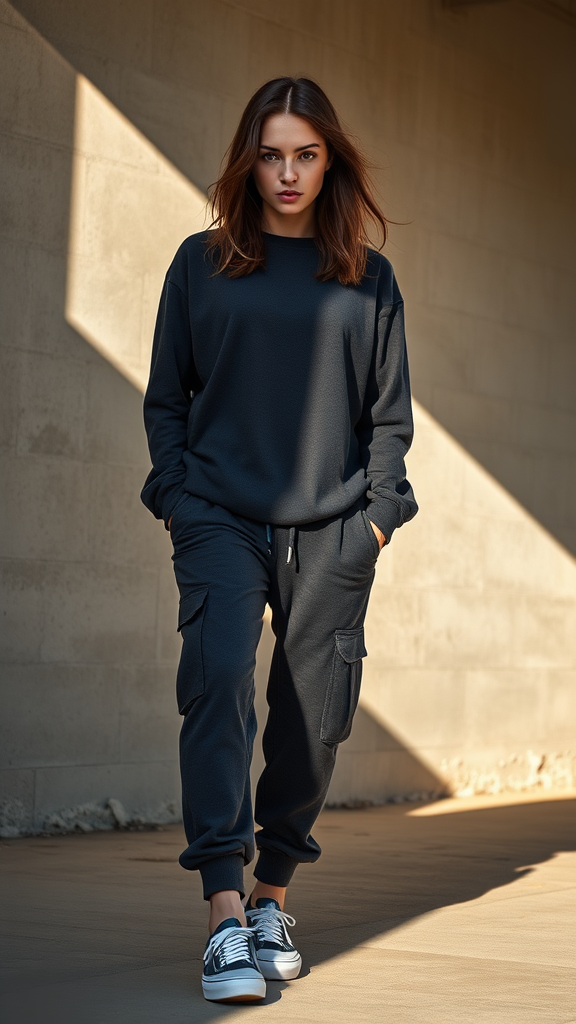 Photography dynamic capture striking perspective full-body front shot of a professional female model with an intense gaze directed at the camera Utilizes a Sony α9 II camera paired with a Sony FE 100-400mm f/4.5-5.6 GM OSS lens delivering a crisp highly defined image The model is styled in an oversized dark grey long-sleeved top dark grey cargo jogger pants and classic Vans skate shoes The scene is enhanced by photorealistic detailing with dramatic interplay of sunlight casting bold shadows and emphasizing rich textures --ar 9:16 --style raw with a unique flair of urban sophistication --profile ue2yzjl --stylize 500 --v 6.1
