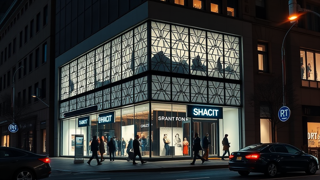 Photography dynamic view, modernism mid-scale store facade design, shot with Canon EOS 5D Mark IV, EF 24mm f/1.4L II USM lens, set to f/2.8 for depth of field highlighting architectural photography. Innovative design blending materials with aesthetic appeal, focusing on clean composition, sharp lines, balanced interplay of light and shadow, in ArchDaily style with high contrast. Facade detail and texture highlighted, showcasing unique patterns and light play through windows, evoking depth and realism with facade as focal point. Night setting with silhouettes of people, car taillights, lens flare effect, photorealistic detail of facade’s design and materials, maintaining realistic scale, aspect ratio 9:16, raw style, stylized level 750, version 6.