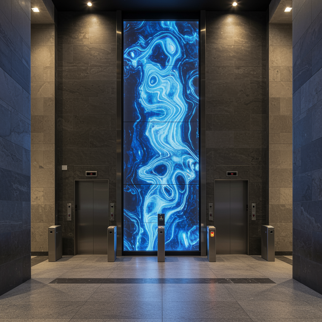 Photography of a sleek and minimalist elevator lobby in a corporate building, captured from the front at eye level using a Canon EOS 5D Mark IV with an EF 24mm f/1.4L II USM lens set at f/2.8. The centerpiece of this composition is a vertical media art installation that radiates a fluid, metallic sheen with shades of blue rippling across its surface, creating a vibrant contrast against the understated elegance of the lobby. The space is characterized by clean lines and features a modern control gate system for secure access. Materials throughout the lobby are premium and chosen for their texture and reflective qualities, enhancing the luxurious ambiance. The image showcases the height and grandeur of the lobby, emphasizing the harmony between technology and art. Ultra resolution detail highlights the material finishes and ambient lighting, capturing the realism of the setting. The aspect ratio of the composition is 9:16, with a raw style and a high degree of stylization and minimal chaos, focusing on realism and elegance.