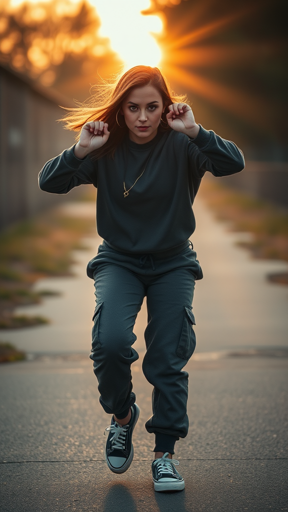 photography, energetic capture, varied focal distance, frontal perspective, professional female model, engaging the camera with intensity, shot using Sony α9 II paired with Sony FE 100-400mm f/4.5-5.6 GM OSS lens, ultra-defined image, dusk-inspired lighting, smoky grey oversized long sleeves, charcoal grey cargo jogger pants, Vans skate shoes, hyper-realistic, vivid intricacies, striking sun rays --aspect ratio 9:16 --raw style --preset ue2yzjl --stylistic influence 500 --version 6.1