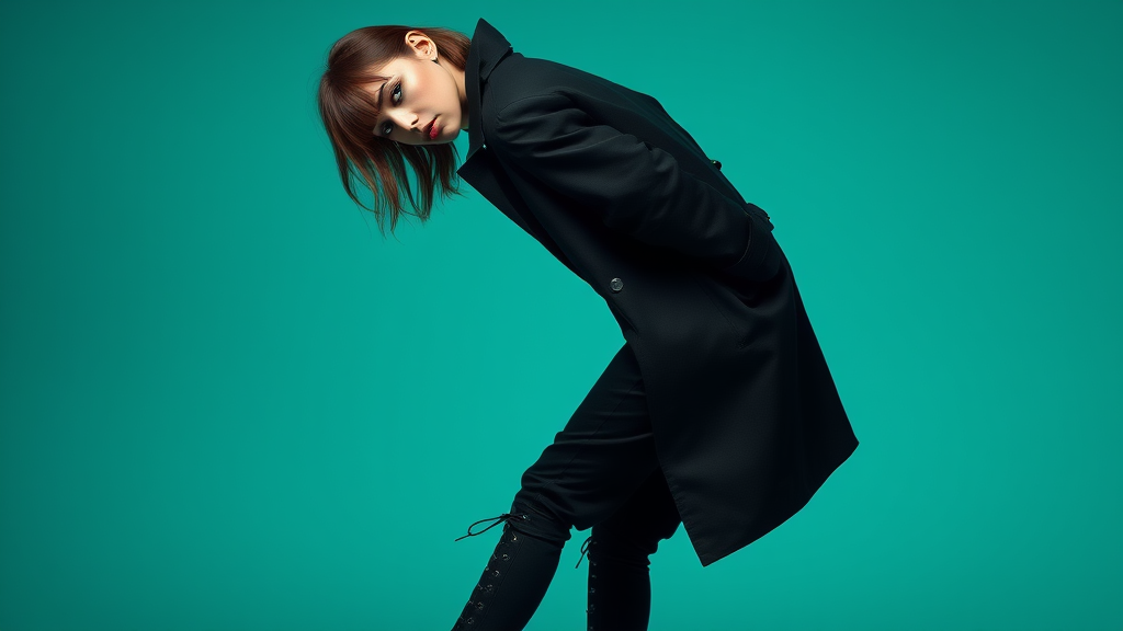 Photography featuring a female model in a striking upper body pose, leaning slightly backward at a 15-degree angle, her head subtly tilted down, showcasing a chic hairstyle with a captivating, provocative expression. She is donned in a minimalist, full-length black coat paired with sleek black cargo jeans and matte black military boots with untied laces, exuding an essence of minimalist fashion. The dramatic silhouette is set against a cool, emerald gradient backdrop, highlighting intricate details and creating an alluring contrast.