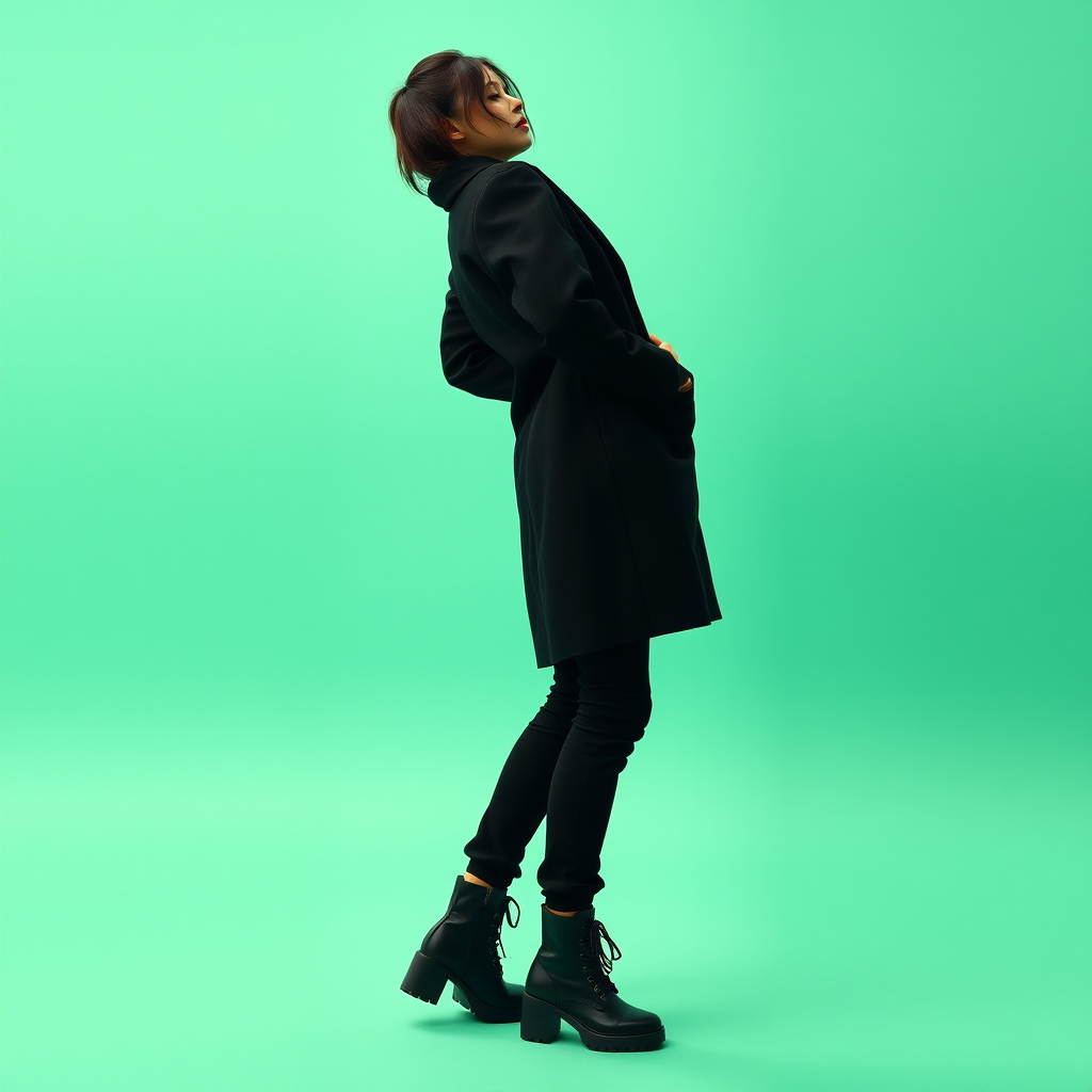 Photography featuring an upper body shot of a female model in a striking side pose, leaning slightly backward at a 15-degree angle with her head subtly tilted down. She exudes a provocative aura, complemented by a chic hairstyle. The model dons a minimalist full-length black coat paired with black cargo jeans, and matte black military boots with untied shoelaces. The fashion theme is minimalist, creating a dramatic silhouette against a serene emerald gradient background. The scene captures rich detail and artistic flair.