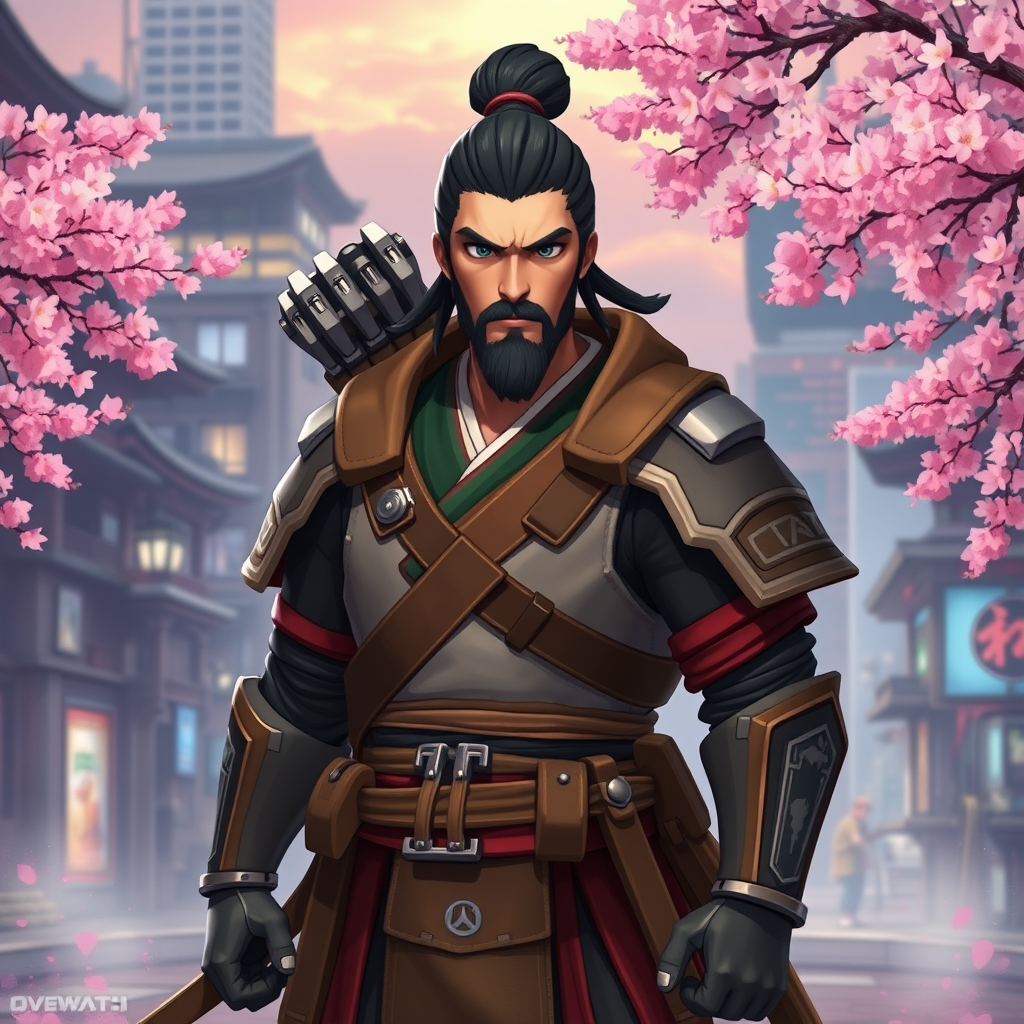 Photography, Hanzo from Overwatch, standing, realistic, full-length, determined expression, key light accentuating facial features and traditional attire, poised archer’s stance, environment blending the game’s futuristic yet culturally rich essence with Japanese architecture, urban cityscapes, and cherry blossoms, medium-wide shot Anime, Cartoon, Manga, CGI, Video Game, Artistry, Painting, subtle embellishments reflecting a harmony of advanced technology mixed with traditional elements.
