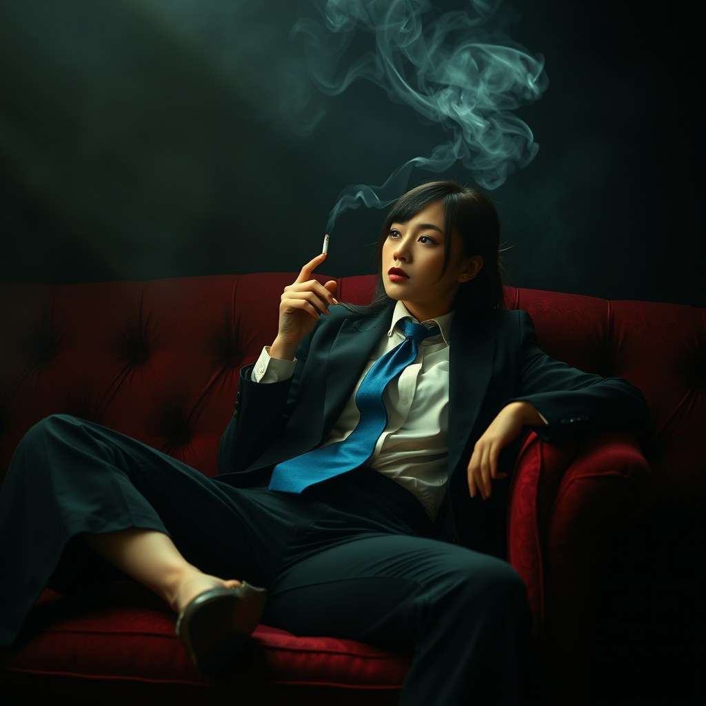 Photography, in a dimly lit room with a hazy atmosphere, features a female figure lounging on a deep crimson rustic couch. She wears a tailored black suit and a crisp white shirt, with a loosely knotted blue tie. Her arm is casually resting on her bent knee, and in her hand, she holds a cigarette, its tip glowing softly as it emits a trail of smoke that swirls languidly around her. A beam of light from an unseen source highlights this scene, filtering through the dense smoke to cast intricate patterns, adding to the moody, dark atmosphere. The cinematic quality of the high-resolution image captures her introspective gaze and contemplative posture, while the ambient glow enhances the intimate mood of the portrait. The contrast between shadows and light heightens the dramatic effect, enhancing the storytelling element of the composition.
