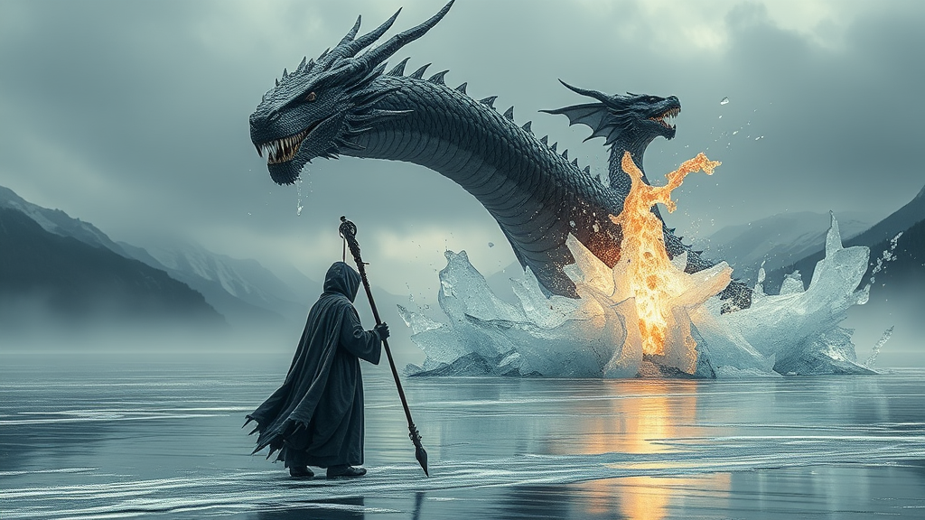 Photography in the style of detailed hyper realism captures a hyper-realistic image that integrates the moody atmosphere of the described figure with an epic scene of a water dragon shattering the icy surface. Standing on the frozen lake, a mysterious robed wizard with a round hood wields a large, ornate staff reminiscent of Raistlin Majere's, emanating an aura of powerful magical energy. The majestic water dragon bursts forth, sending ice shards flying in every direction. The landscape features a muted color palette, with misty mountains and a brooding sky in the distance, conveying a mixture of somberness and the palpable intensity of magic at play. The scene embodies the essence of a dramatic fantasy moment with creative touches while maintaining a sense of realism and atmospheric depth.