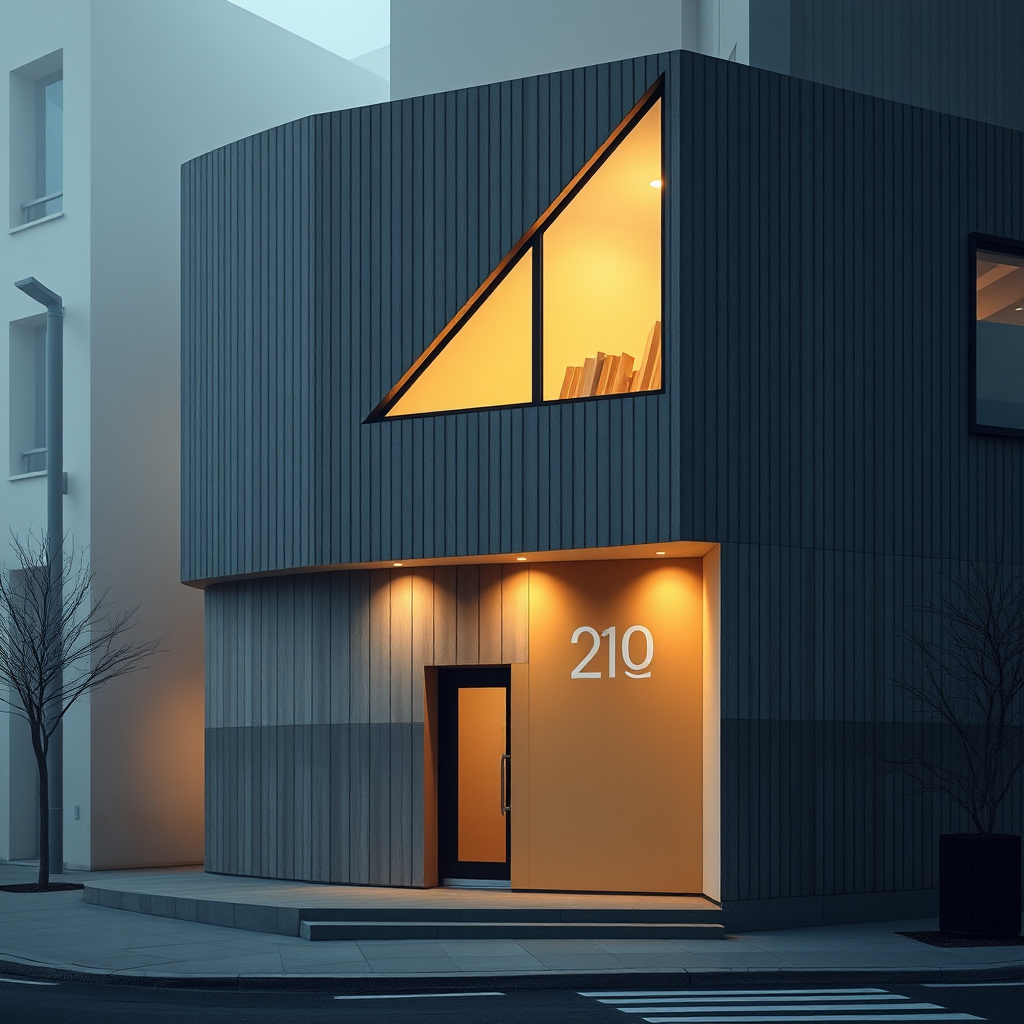 Photography minimalist small building facade design with Canon EOS 5D Mark IV depth of field highlighting architectural photography design blends innovative and aesthetically pleasing materials focus on clean composition sharp lines balanced interplay light and shadow archdaily style high contrast emulating professional architectural photographer approach highlighting facade details textures evoke depth realism emphasis on facade focal point dramatic light foggy realism sunlight photorealistic no unreal scale ar 9:16 style raw stylize 750 v 6.