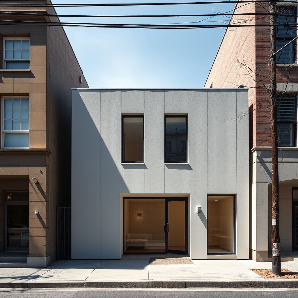 Photography minimalist small building facade design Canon EOS 5D Mark IV depth of field highlighting architectural photography blending materials innovatively and aesthetically pleasing clean composition sharp lines balanced interplay light shadow archdaily style high contrast professional architectural photographer highlighting facade details and textures evoking depth realism emphasis on facade as focal point dramatic light foggy realism sunlight photorealistic realistic scale aspect ratio 9:16 raw style stylize 750 version 6