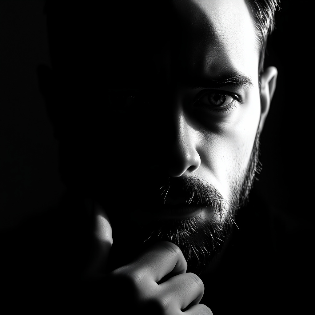 Photography monochrome front view capturing the stark essence of classic noir with an intimate psychological edge close-up profile using strategic lighting to accentuate features and create depth black and white digital photography focused on texture and contrast utilizing Canon EOS 5D Mark IV renowned for its full-frame sensor's detailed gradations in tone Canon EF 85mm f/1.2L II USM with shallow depth of field manual mode employing single off-camera flash with snoot for controlled beam camera stabilized on tripod male subject in his thirties with introspective gaze well-groomed beard accentuated by highlights where light grazes deep-set eyes beneath furrowed brow suggesting internal conflict minimalist setting to maintain focus on subject’s emotive presence absence of background deepening narrative carried by expression interplay of light across features enveloped in darkness emphasizing light-shadow contrast low key illumination with single source creating diagonal divide on face echoing chiaroscuro technique's interplay of reveal and concealment light highlights ridges of facial features hand thoughtfully posed fingers resting gently on chin enhancing introspective quality inviting viewer into silent private reflection serving as canvas for viewer's interpretation of light shadow and human condition layers UHD--ar 9:16 --style raw --stylize 600.