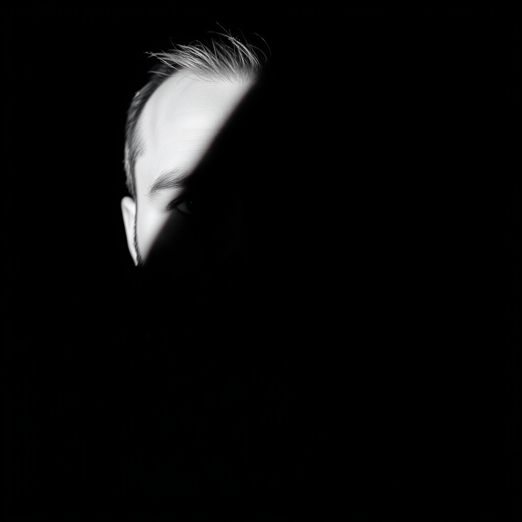 Photography, monochrome, front view, drawing inspiration from classic noir with an intimate, psychological edge. Captured in close-up profile, strategic lighting accentuates features and creates depth. Black and white digital photography focuses on texture and contrast. Shot with a Canon EOS 5D Mark IV and a Canon EF 85mm f/1.2L II USM lens, which offers a shallow depth of field. The camera is set in manual mode, using a single off-camera flash with a snoot for directed light. The camera is placed on a tripod for stability. The subject is a male in his thirties, with a well-groomed beard highlighted by grazing light, his gaze introspective, deep-set eyes, and a furrowed brow showing concentration or internal conflict. The minimalist setting avoids distractions, with the absence of a background focusing on the subject's emotive presence. The darkness envelops him, emphasizing the stark light and shadow contrast on his face, in a low-key style. A singular light source creates a diagonal divide, echoing chiaroscuro's theme of revelation and concealment. Light highlights the ridges of his facial features, while his thoughtful hand rests gently yet firmly on his chin, adding introspective quality. The portrait invites viewers into a private moment of reflection, imbued with profound silence and prompting personal interpretations of light, shadow, and human complexity. UHD--ar 9:16 --style raw --stylize 600.
