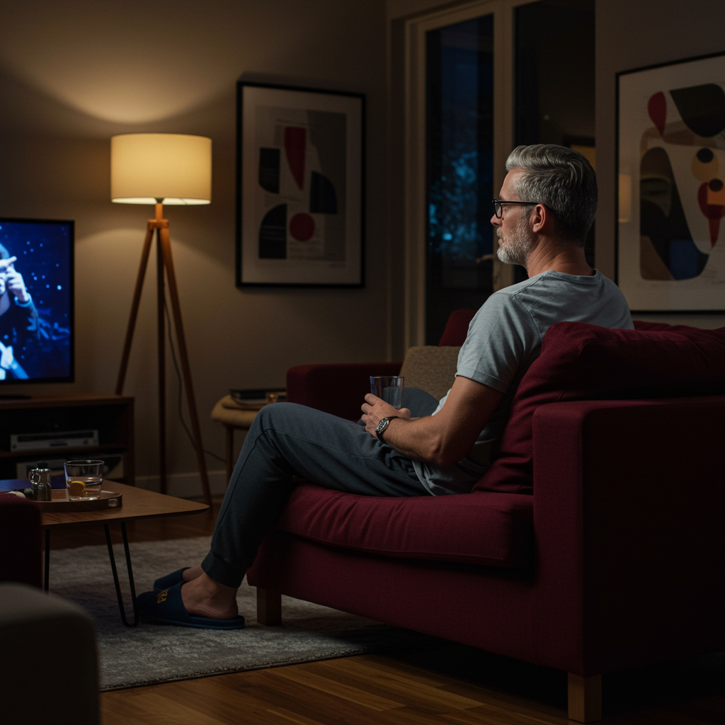 Photography of a 45-year-old Caucasian man, viewed from the back, seated on a deep burgundy sofa in a contemporary living room at night. He has closely cropped, silver-streaked hair and a neatly trimmed short beard. He wears stylish, oval-shaped glasses with black frames. Dressed in a light gray T-shirt, dark charcoal sweatpants, and navy blue slipper sandals, he is watching a flat-screen TV. The room has a warm and inviting ambiance, with soft lighting and minimalistic decor, including a modern floor lamp and abstract art on the walls. The scene is captured in high resolution, with a photorealistic quality.