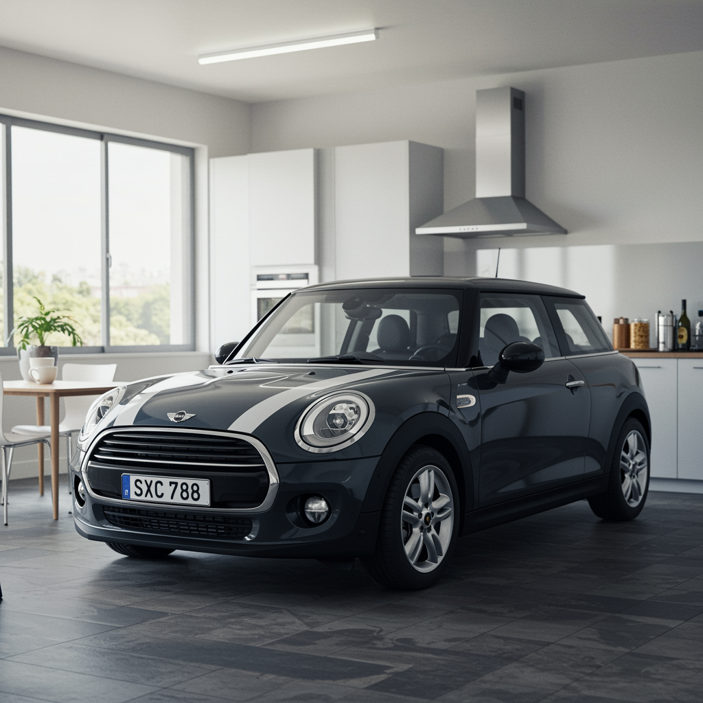 Photography of a compact Mini Cooper car parked inside a modern kitchen, featuring professional color grading with soft shadows and minimal contrast. The image is captured in sharp focus using high-resolution 8k rendering, showcasing intricate details reminiscent of film photography. The scene is set in a bright, HDR-lit room, emphasizing the sleek design of the car and the kitchen's contemporary ambiance. The photo offers a clean, polished aesthetic with a stock photo quality, while adding a slight vignette to enhance the visual depth and creativity.
